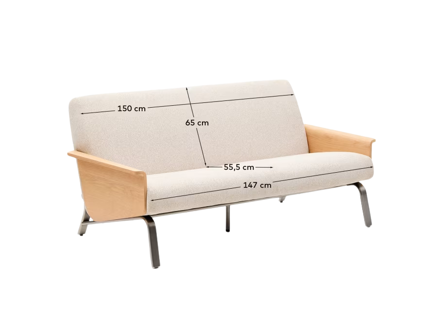Amsen beige 2-seater sofa in oak plywood with brushed stainless steel legs 150cm