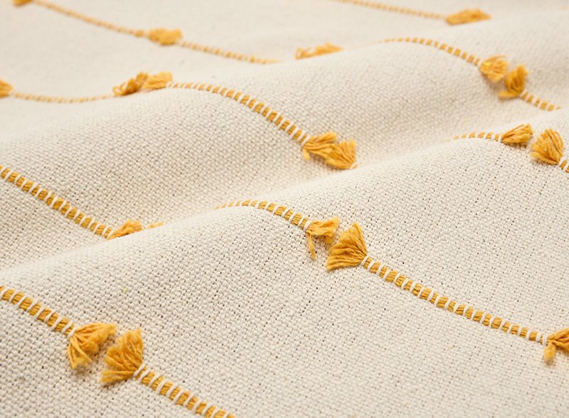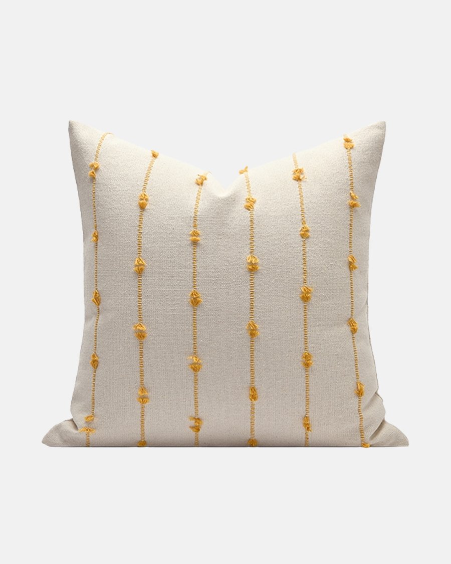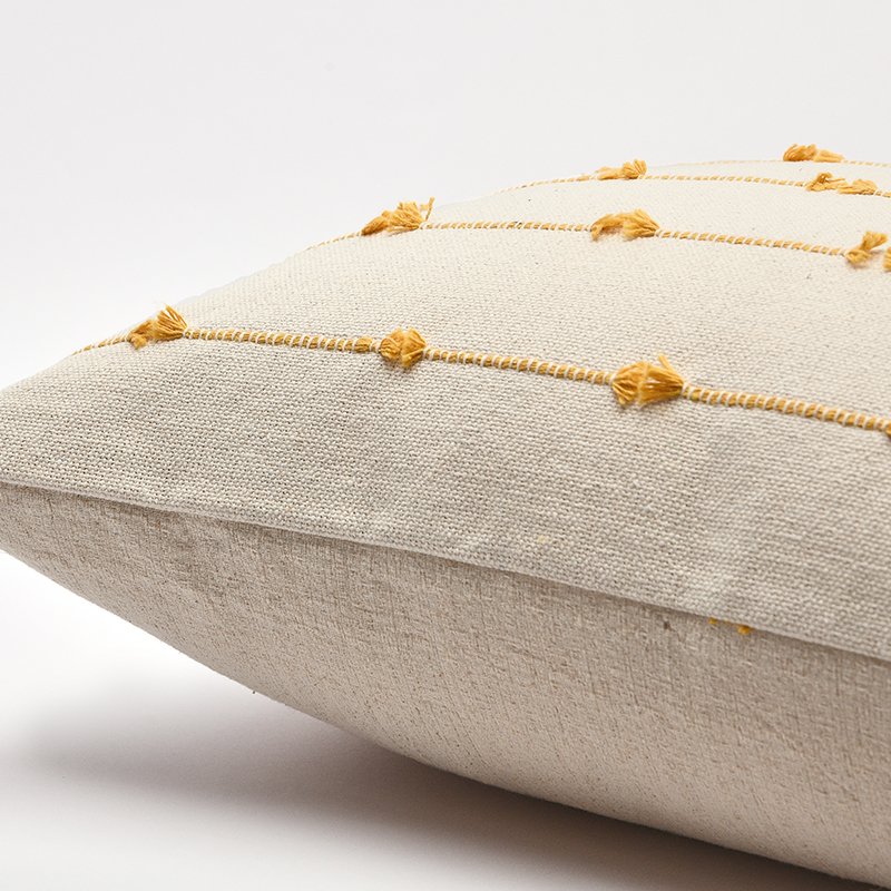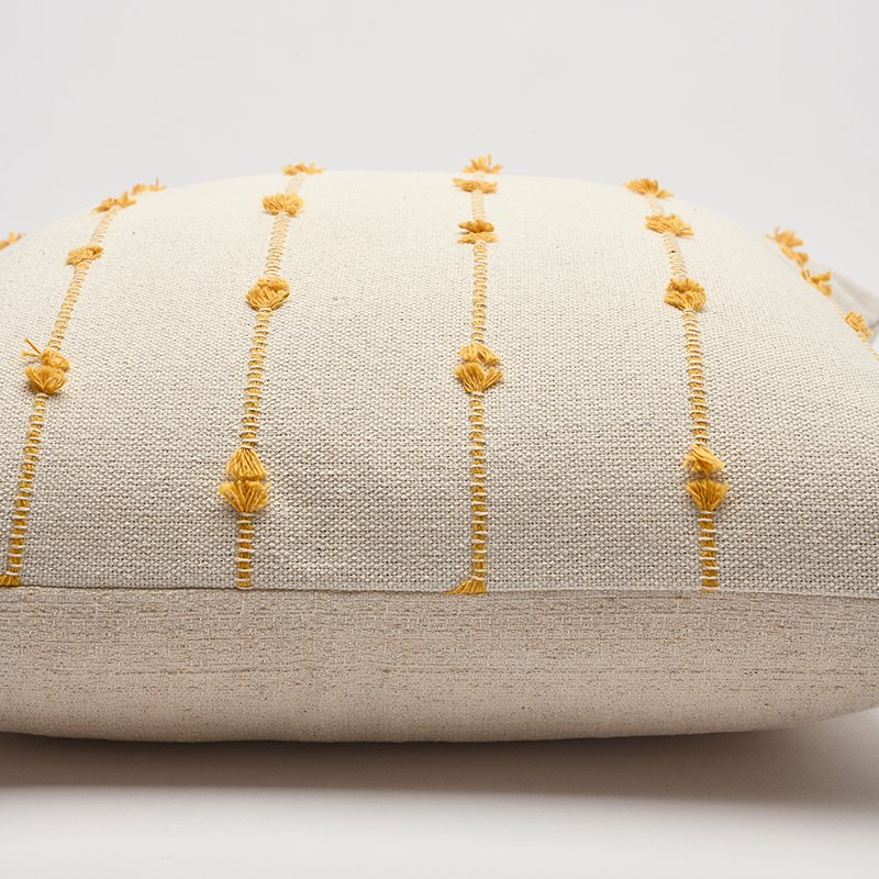 Let the sun shine in! This cream-colored cushion features delicate vertical lines of golden-yellow tufted dots, resembling a soft summer rain. The textured details add a tactile element that little fingers will love to explore. Simple, sunny, and stylish.