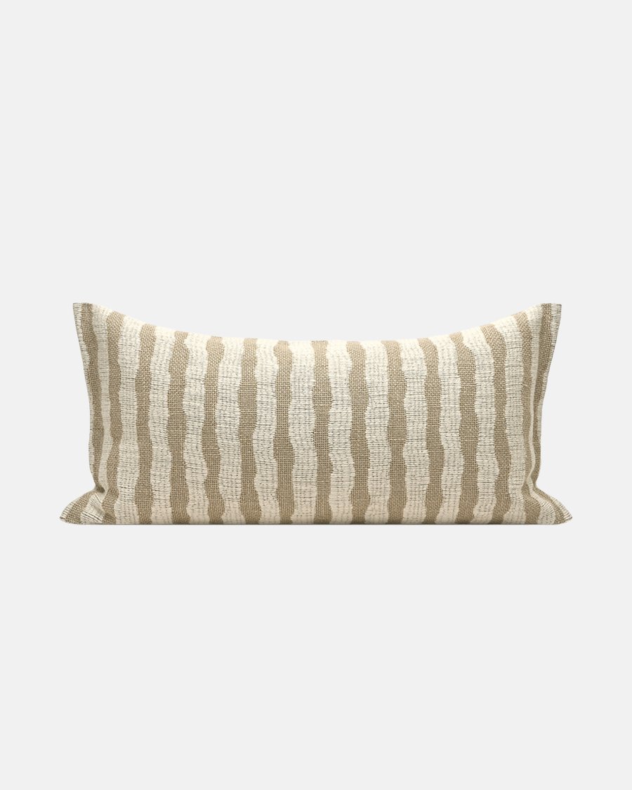 • Features unique, vertical, irregular wavy cream-colored stripes on a natural tan background.