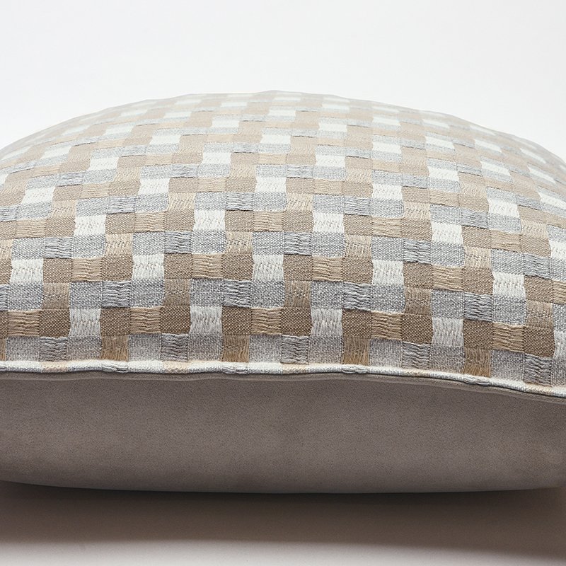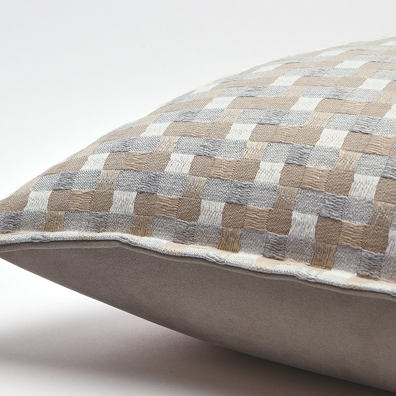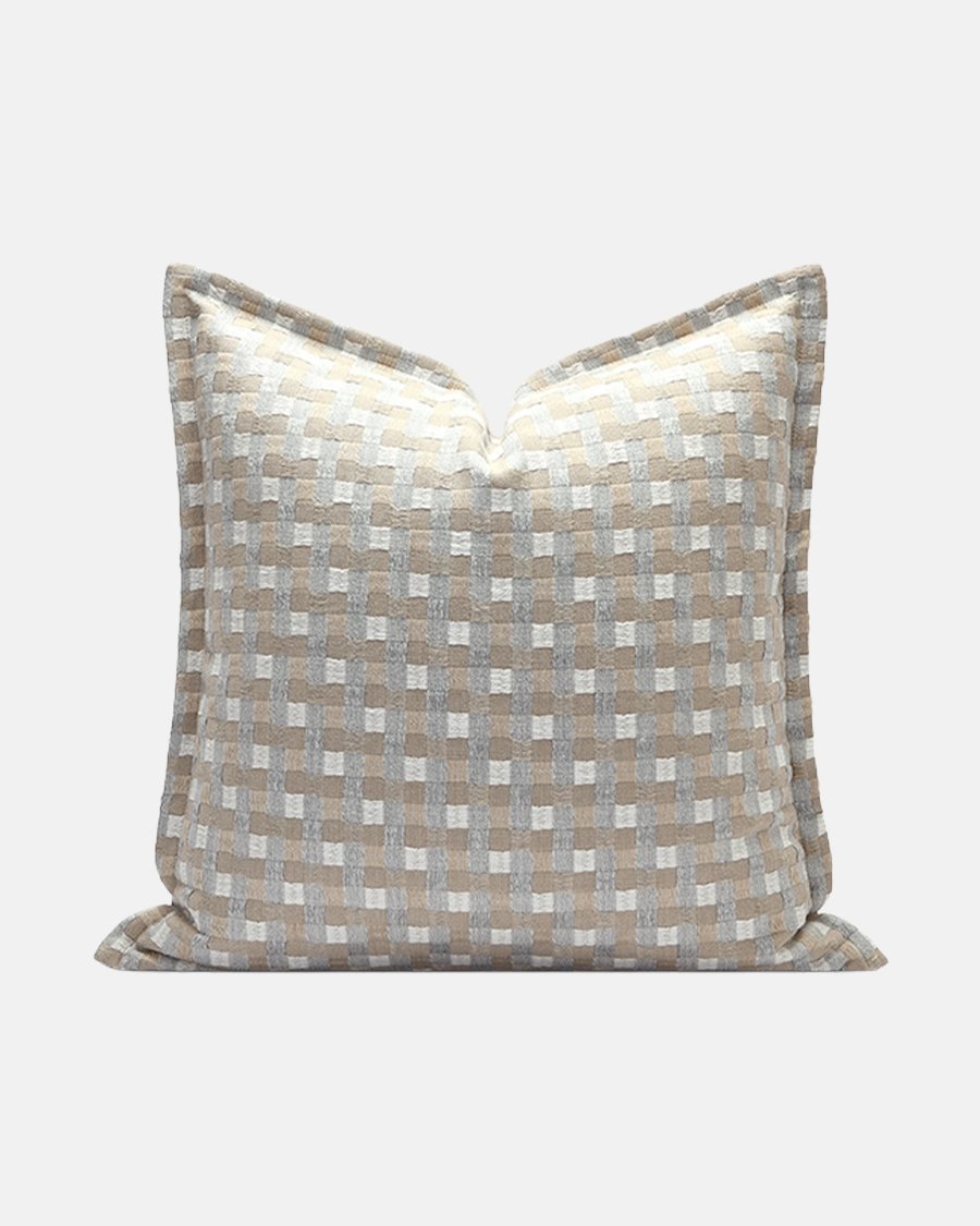 - Features a classic, architectural grid pattern in soothing sandy and grey tones.